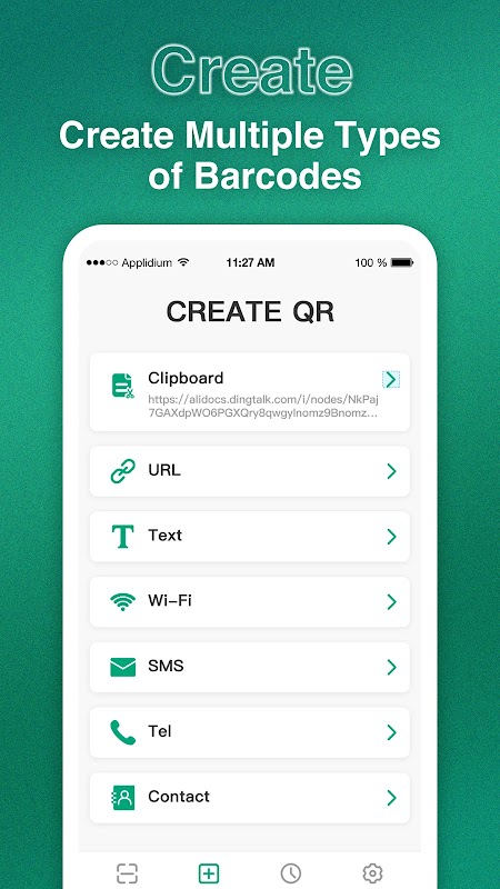 Crea: informazioni di contatto, e-mail, attività, posizione, numero di telefono, informazioni sul telefono, testo, sito Web, dettagli Wi-Fi.