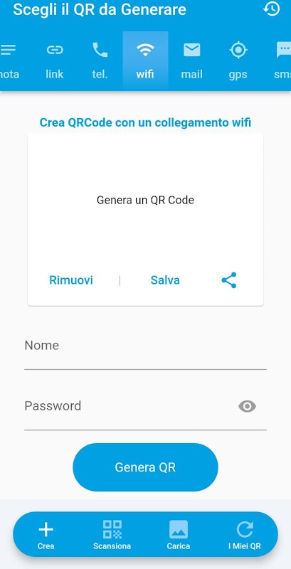 Il generatore è facilissimo da usare, basta scegliere il tipo di QRCode da generare e compilare i dati, successivamente ti basterà un tocco per condividerlo tramite qualsiasi app.