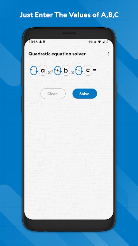 L'app può trovare sia radici reali che complesse. Devi solo inserire i coefficienti/parametri dell'equazione.