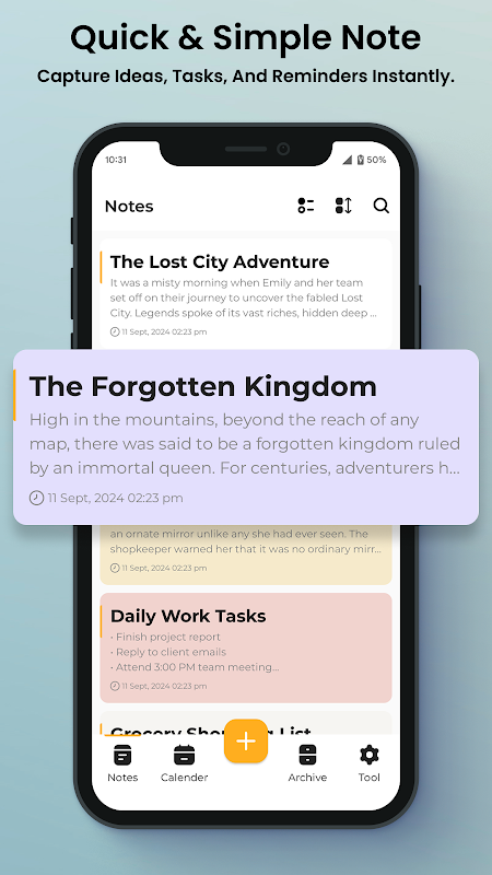 1. Crea note semplici e veloci: cattura facilmente le tue idee, elenchi di cose da fare o promemoria importanti. L'interfaccia intuitiva dell'app garantisce che la creazione e la modifica delle note sia un'esperienza rapida e fluida.