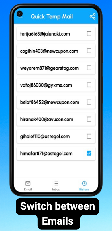 Quick Temp Mail ti consente di creare e gestire le tue e-mail temporanee in pochi secondi, il generatore di e-mail temporanee più veloce ed efficiente in movimento! Proteggi la tua privacy e semplifica la tua esperienza online con la nostra app intuitiva.