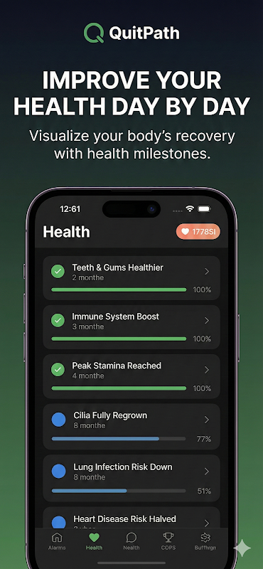 QuitPath trasforma la tua decisione di smettere di fumare in un'esperienza motivante. Più di un semplice contatore, è il tuo coach personale.