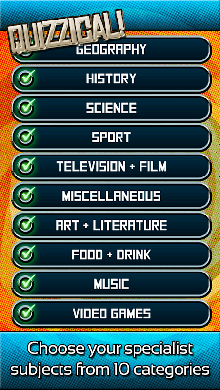 Geography, History, Science, Sport, TV & Film, Miscellaneous, Art & Literature, Food & Drink, Music and Video Games.