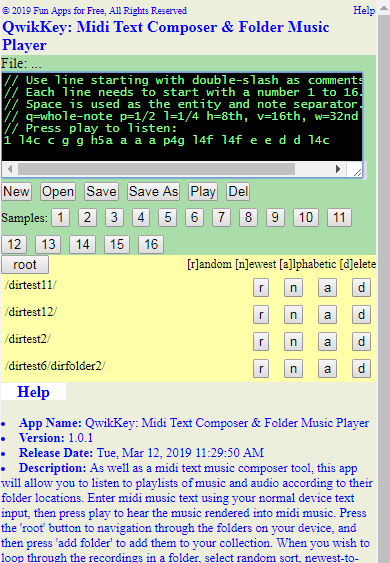 * Description: As well as a midi text music composer tool, this app will allow you to listen to playlists of music and audio according to their folder locations. Enter midi music text using your normal device text input, then press play to hear the music rendered into midi music. Press the 'root' button to navigation through the folders on your device, and then press 'add folder' to add them to your collection. When you wish to loop through the recordings in a folder, select random sort, newest-to-oldest, or alphabetic sort.