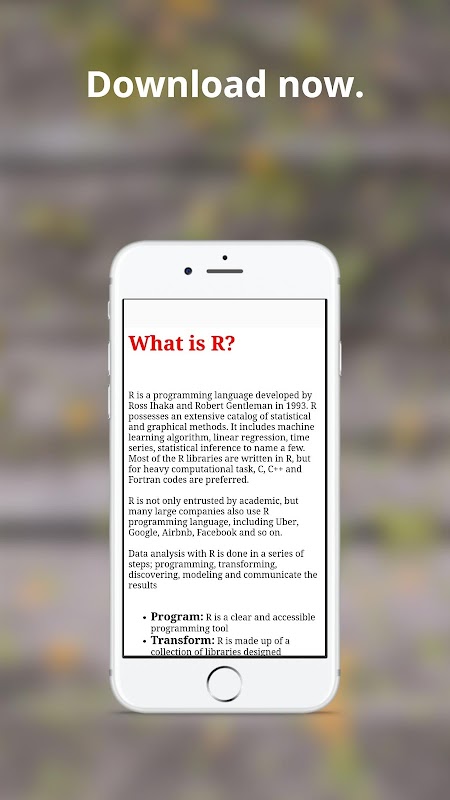 Whether you are an experienced programmer or not, this Application is intended for everyone who wishes to learn the R Programming language. R Tutorial is a complete application for those who want to learn R easily and for free. This application provides a tutorial for beginners as well as a working professional. R Tutorial application provides a good understanding of Data Science. This step-by-step guide is letting you know each aspect of R.