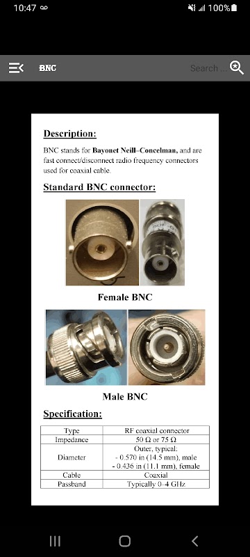 Questa applicazione è stata progettata per aiutare le persone che lavorano nel campo RF e radiofrequenza a sapere rapidamente che tipo di connettore stanno utilizzando. Il nostro team fa anche qualche breve introduzione e le condizioni standard della frequenza di lavoro di ciascun connettore. Non siamo produttori e siamo solo entusiasti della carriera RF.