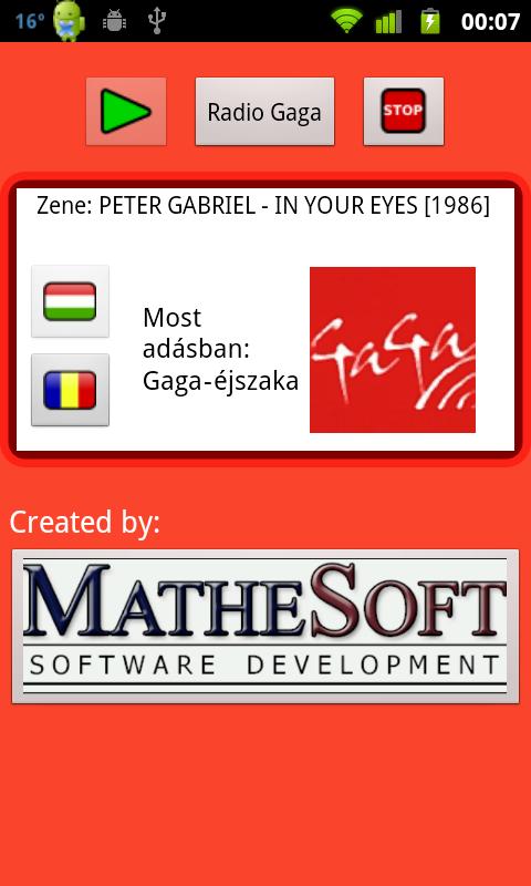 Nella schermata del: "Zene: PETER GABRIEL-NEGLI OCCHI ..." è il "giocare ora" e il "programma è:" La maggior parte adásban: Gaga éjszaka "e un'immagine ner le informazioni text.Those sono richiesti e analizzata dal sito radiogaga e visualizzati in app. Solo per questa informazione è le impostazioni della lingua, che può essere solo la lingua ungherese e rumena al momento.