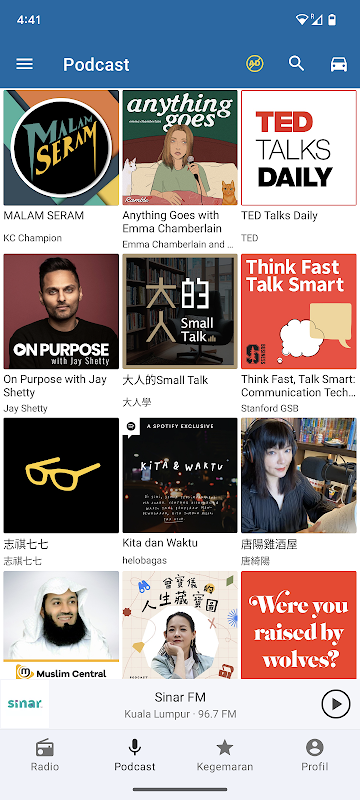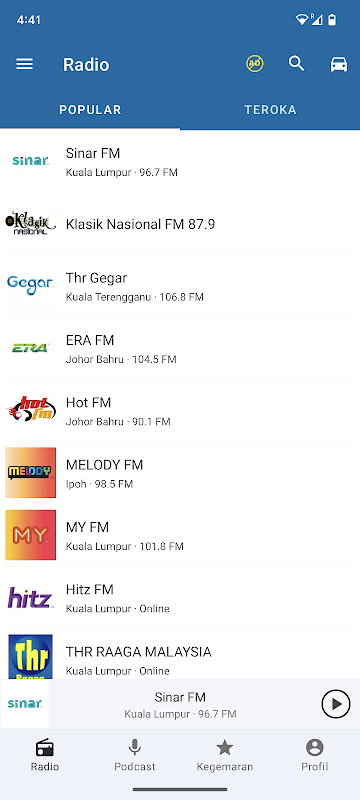 Ascolta facilmente tutte le stazioni radio malesi, le trasmissioni FM e AM e i tuoi podcast preferiti, tutto in un'unica semplice app.