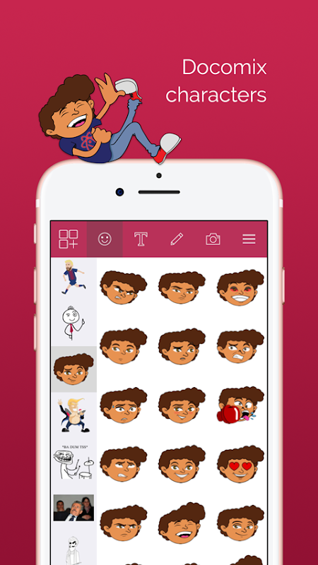 Hai un'idea divertente, ma non sai dove crearla? L'app per dispositivi mobili Docomix è la tua soluzione: crea fumetti di rabbia, fumetti divertenti, meme divertenti, battute divertenti, storie, presentazioni e altro ancora. Solo con pochi clic, inserisci immagini dalla tua galleria o cerca nel Web, aggiungi testo, disegna i tuoi personaggi o scegli tra le nostre facce gratuite di rabbia, facce di meme o troll e altro ancora.