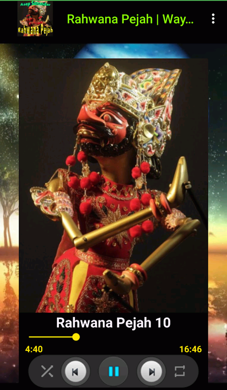 Goditi la raccolta di Sundanese Wayang Golek in un'opera teatrale intitolata Rahwana Pejah, eseguita da Ki Dalang Asep Sunandar Sunarya. Lo spettacolo di marionette Rahwana Pejah racconta la storia della lotta di Bathara Rama per rivendicare Dewi Sinta che è stato rapito e vuole essere la moglie di Rahwana. Bathara Rama deve combattere contro le potenti truppe di Rahwana. Sebbene molte delle sue truppe siano morte, con i suoi poteri soprannaturali, Rahwana sopravvisse ancora. Rahwana ha continuato a sopravvivere all'assalto di Bathara Rama? Qual è il destino di Dewi Sinta? Quanto è stata grande la battaglia? Installa e trova la risposta.