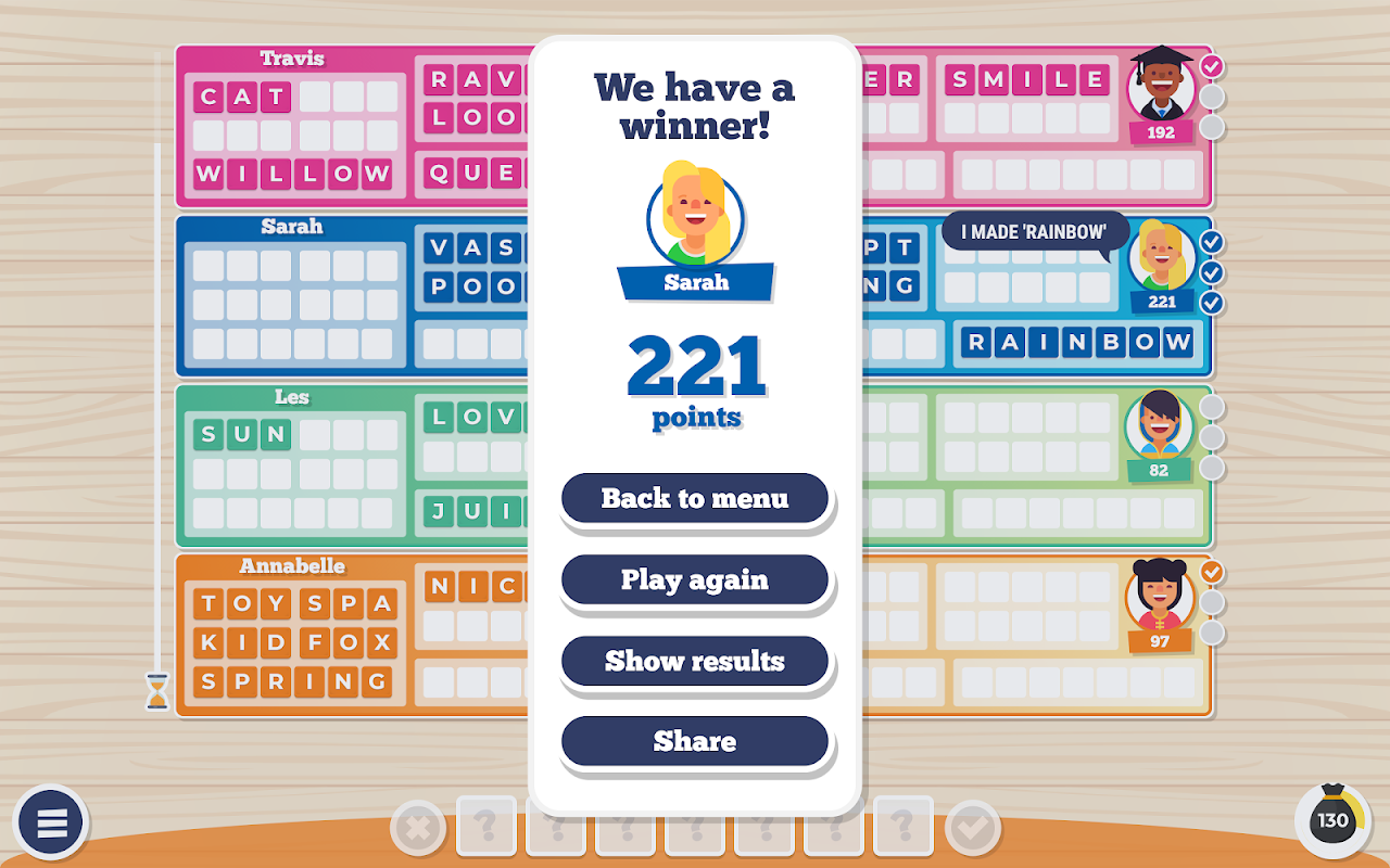 • Diventa il giocatore con il maggior numero di punti dopo che tutte le tessere lettere sono state pescate. Ci sono 150 lettere disponibili in totale.