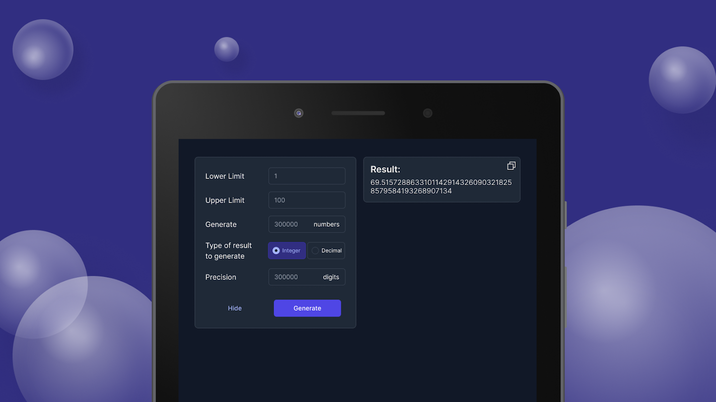 Scopri l'app Random Number Generator Calculator, uno strumento dinamico e intuitivo creato per professionisti, studenti e chiunque richieda numeri casuali per vari scopi. Dalle semplici simulazioni della lotteria al campionamento statistico avanzato, la nostra app soddisfa tutte le tue esigenze di numeri casuali con precisione ed efficienza.