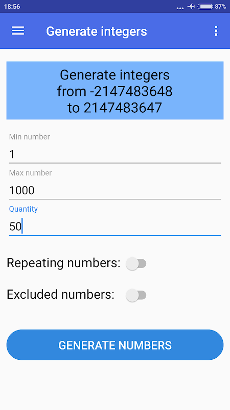 Puoi anche decidere se escludere o meno numeri specifici, se vuoi che i numeri casuali vengano ripetuti o meno e ordinare i risultati in ordine crescente o decrescente (l'ordine predefinito è casuale).