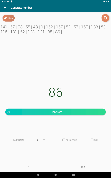 ○ Condividi i risultati con altri. Invia numeri o elenchi generati ai tuoi amici direttamente dall'app. Per divertirti, puoi persino generare un numero di telefono casuale. L'app utilizza un affidabile algoritmo casuale Java per garantire risultati equi.