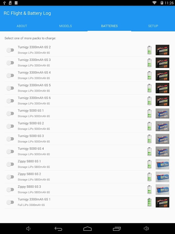 Memorizza foto di modelli, batterie, piloti e pezzi di ricambio.