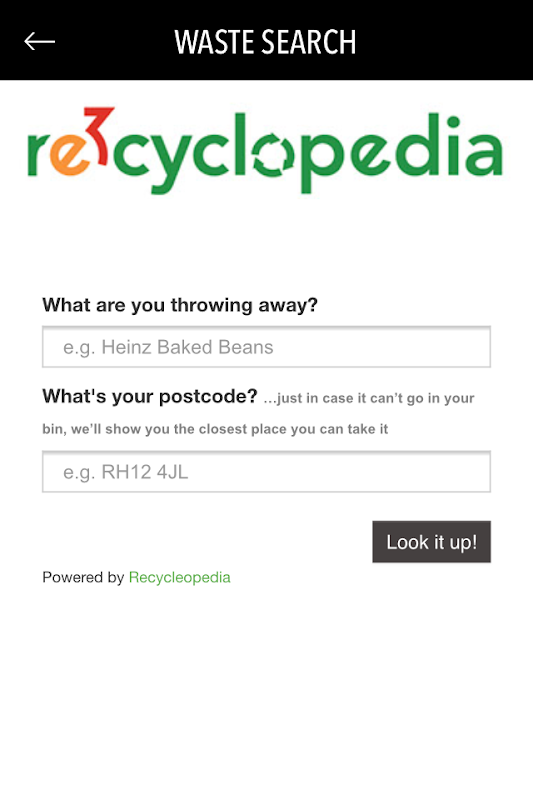 re3cyclopedia ti aiuta a riciclare correttamente, a riciclare di più ea sprecare meno. Cerca gli oggetti per scoprire come possono essere riciclati, compostati o disposti correttamente nei distretti di Foreste di Bracknell, Reading e Wokingham. Controlla quando sono le date della tua collezione e i centri di riciclaggio e le banche più vicini.