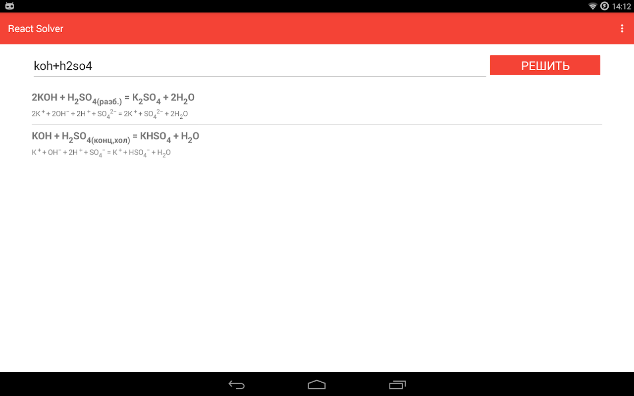Приложение для быстрого решения химические реакций. Отличная помощь школьникам и студентам. Для поиска решений не надо учитывать коэффициенты.