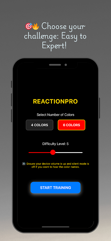 ReactionPro è l'app di allenamento definitiva per migliorare il tempo di reazione, l'agilità e la velocità. Progettato per atleti di tutti i livelli, affina i riflessi con esercizi dinamici basati sui colori. Che tu giochi a tennis, calcio, basket o qualsiasi sport che richieda un gioco di gambe veloce, ReactionPro ti aiuta ad allenarti in modo più intelligente e a muoverti più velocemente.