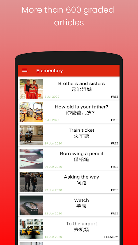 • Studia il cinese con oltre 600 lezioni di mandarino suddivise in 6 livelli di difficoltà: principiante - HSK1, elementare - HSK2, intermedio - HSK3, intermedio superiore - HSK4, avanzato - HSK5 e competente - HSK6, in modo da poter scegliere il materiale di lettura secondo il tuo livello di cinese.