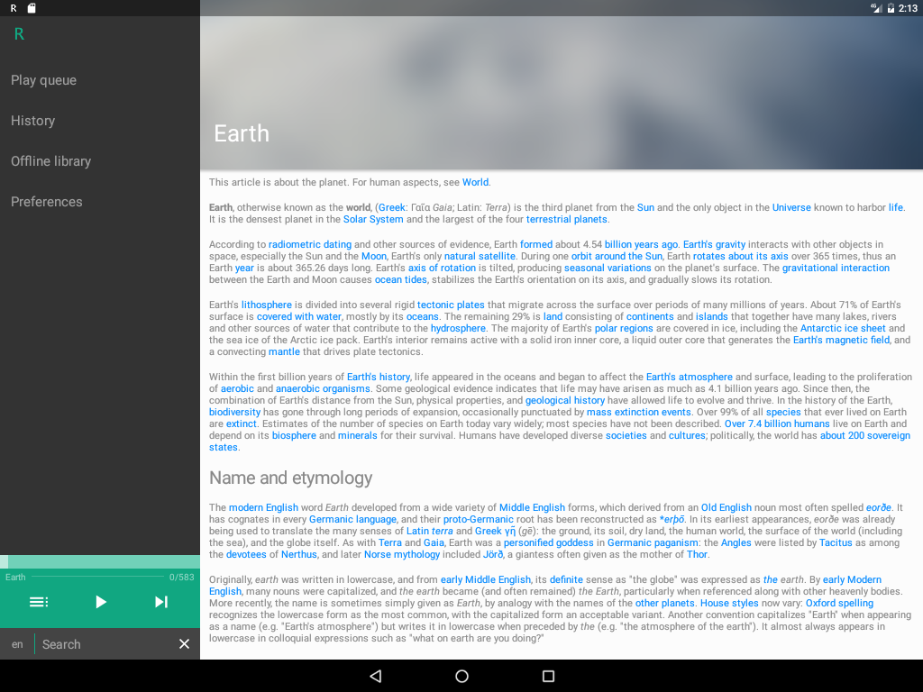 Play Wikipedia™ articles with Text to Speech (TTS) using this music player-like app. Use the play queue and offline mode features to always have content to listen to.