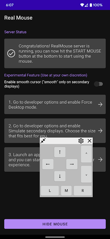 Con Real Mouse, sarai in grado di navigare tra i display principali e secondari (esterni) con un touchpad simulato. A causa delle limitazioni di Android, non avrai il cursore "liscio" sul display principale, mentre sui display secondari lo avrai. Immagine che avvii un'app su un monitor esterno o su uno qualsiasi dei display secondari nel menu delle opzioni dello sviluppatore, sarai in grado di utilizzare il trackpad virtuale per navigare tra le app con un gioco da ragazzi e funziona proprio come un vero mouse (è poiché l'app comunica direttamente con il modulo del kernel /dev/uinput)!