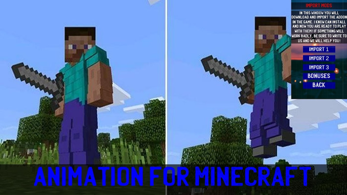 Grazie a queste Mod MCPE di animazione realistica non dovrai più utilizzare noiosi strumenti standard e armature di bassa qualità, perché da questo momento ti si aprirà un mondo di nuove cose! Tutti i giocatori vorranno giocare solo con te e questa Mod inizierà a invidiare te e i tuoi amici e ti aiuterà anche a rilassarti e divertirti!