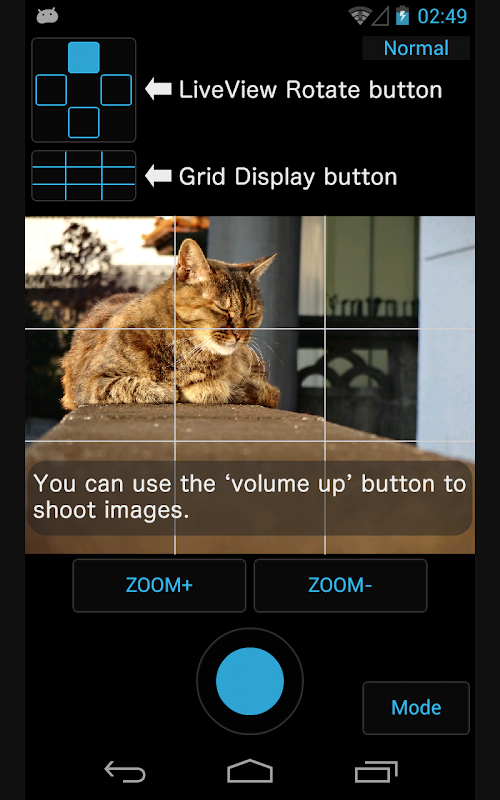 Normal mode for taking pictures. You can use the 'volume up' button to shoot images.