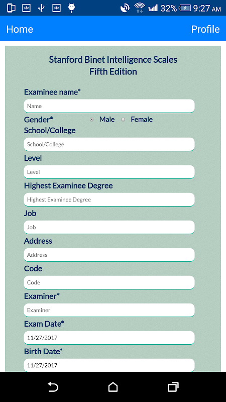 This application is an electronic application of the record form of Stanford Binet Intelligence Scales- Fifth Edition (Revised Edition). This application helps to record the raw scores of the examinee. Also, it accurately determines entry, reverse and stop rules away from self- errors. Moreover, it determines the entry level of each domain of the domains of the scales. At the end, the application compiles the raw scores of each sub-test. The form is stored in the individual's profile and an email with a link is sent to open the form so that you can go back to the form at any time. The application can be installed on mobile phone or on regular PC.