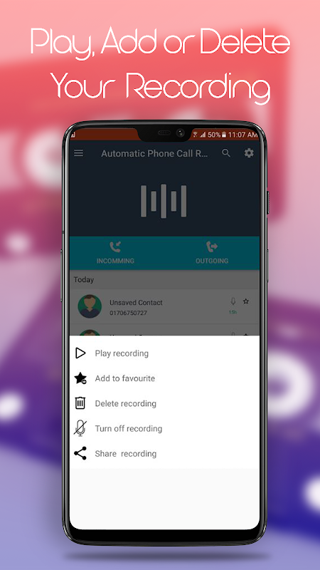 Our Record Phone Calls (Android App with Pattern Lock)records your calls automatically, so and you don't need to turn on/off every time. But you will get an option here to turn off recording during a call if you don't want it to be recorded. Besides, this amazing app features a share button to share your records with your friends and family to spread the fantastic and surprising moments.