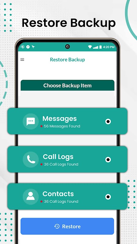 • Semplicità nel Ripristino: Recuperare dati persi è un gioco da ragazzi. Con “Recupera Messaggi e Chiamate Cancellati” puoi ripristinare senza problemi la cronologia delle chiamate, i messaggi di backup e i contatti su qualsiasi dispositivo Android.