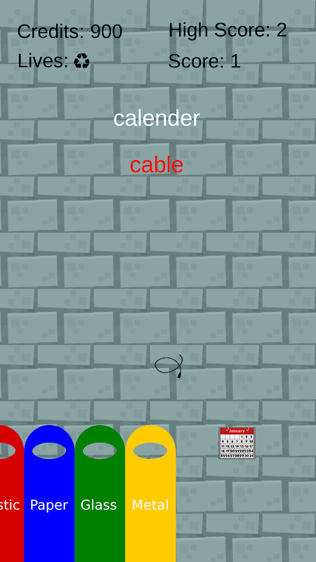 There are 4 connected bins of glass, plastic, metal and paper which can be moved left and right to collect falling items.