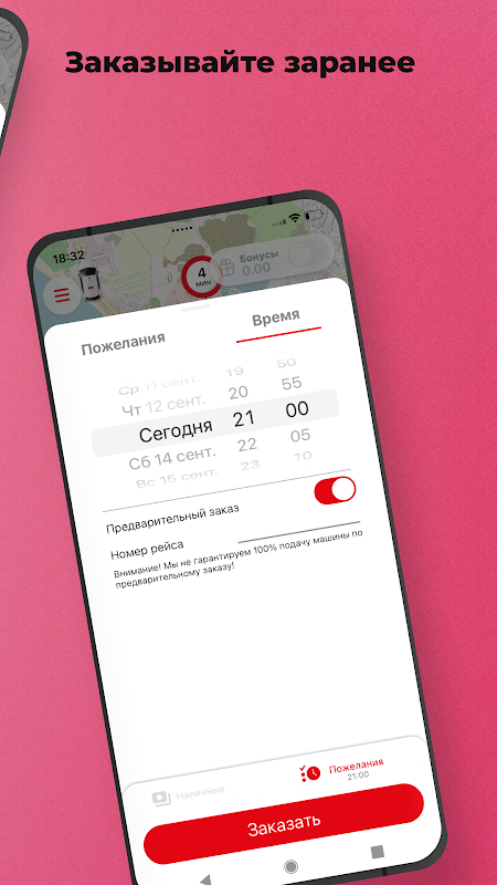 Seleziona l'opzione "Preordina". La ricerca dell'auto inizierà poco prima dell'ordine del viaggio e l'auto arriverà all'orario stabilito. Potrai conoscere in anticipo anche il costo del viaggio.
