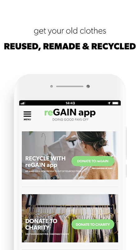 E se ti dicessimo che utilizzando la nostra app reGAIN puoi inviare i tuoi indumenti indesiderati per il riciclaggio da oltre 25.000 punti di consegna in tutto il Regno Unito in modo assolutamente gratuito, o donarli in beneficenza in pochi clic e in cambio ottenere buoni sconto sul tuo prossimi acquisti?