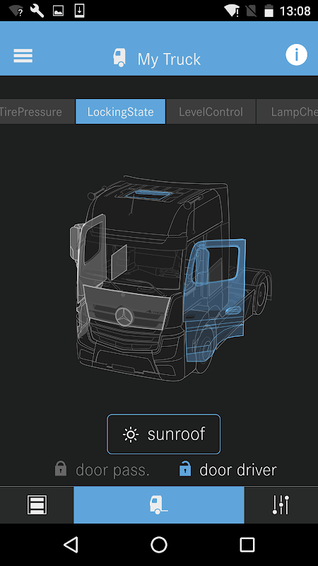 The Remote Truck App displays current vehicle data to the user. Further on exclusive vehicle functions can be controlled. Monitore: -Total Kilometer -Engine Hour -Fuel Level -Adblue Level -Outside Temperature -Inside Temperature -Brake Pressure1 -Brake Pressure2 -Tire Pressure -Tire Temparature -Tire Sensor Battery Status -Axle Load -Locking State Control: -Sunroof -Level Control -Lampcheck -Working Lamp -Independent Heating -Parking Cooler -Interior Light -Audio -Unlock Tail Lift. Connection: WIFI, Range: 25m around the vehicle