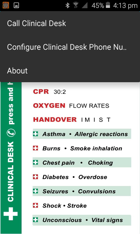 Essential First Aid information suitable for individuals with some first aid experience who may be first on scene incident responders. Packaged in an easy to access app with no adds or unnecessary clutter. Each section can be accessed via a single click. There is also provision to initiate a call to a second level help facility by way of a pre-configured number.