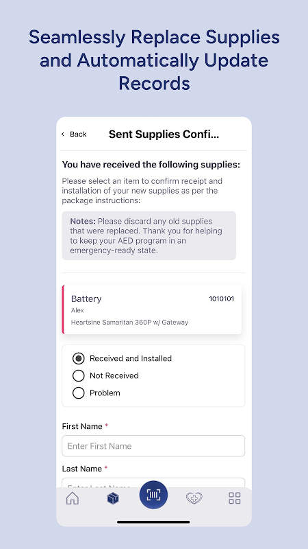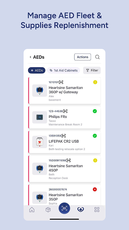 Assicurati che i tuoi defibrillatori automatici esterni (DAE), gli armadietti di pronto soccorso e i kit di controllo dell'emorragia siano pronti a rispondere quando si verifica un'emergenza. Usa il tuo smartphone per registrare le ispezioni di disponibilità in movimento ed esaminare problemi come le prossime scadenze delle forniture e le esigenze di manutenzione. Le credenziali di accesso sono legate al tuo livello di accesso, fornendoti solo le informazioni di cui sei responsabile.