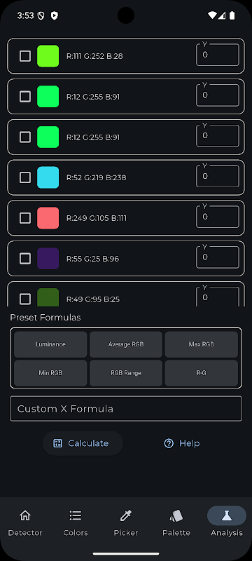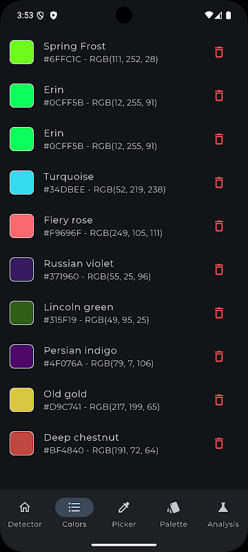 Rilevamento del colore e tavolozze ad alta precisione. RGB, CMYK, HSV, HTML, HEX, HSL.