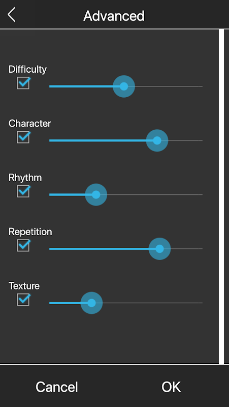 Crea il tuo riff regolando i cursori di difficoltà, carattere, ritmo, ripetizione e trama. Ogni parametro ti aiuta a scolpire il riff secondo i tuoi gusti.