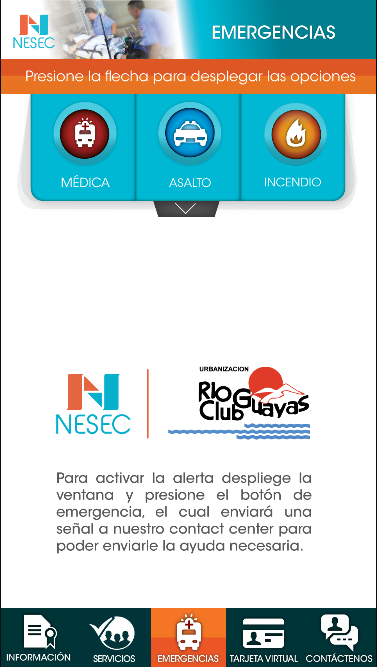 NESEC presenta el "Aplicativo de Asistencia en Emergencias medica, asalto e incendios", el cual brinda información detallada del servicio de asistencia para el uso exclusivo de los residentes de la Urbanización Rio Guayas Club con atención las 24 horas del día.