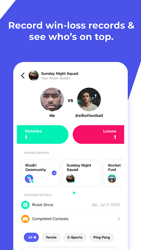 Rivalri is the ultimate destination for competition between friends and the masses. Track all of your competitions among friends and see who reigns supreme, or compete in free-to-play pick'em style contests.