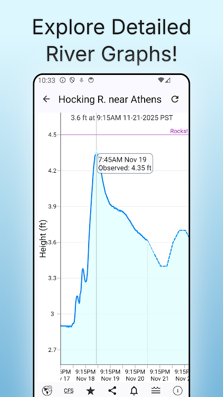 Personalizza i tuoi idrogrammi con indicatori di livello personali per ponti, banchi di sabbia, rocce o livelli di navigazione sicuri. Aggiungi i tuoi idrogrammi preferiti per un monitoraggio rapido in qualsiasi momento.