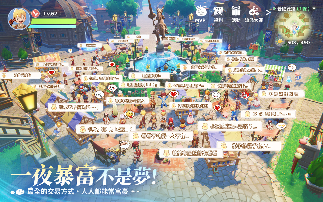 - Scegli tra un'ampia varietà di luoghi e commercia liberamente per guadagnare una fortuna! Crea le bancarelle più popolari nella piazza, stabilisci i tuoi prezzi per dominare il mercato, mostra il tuo acume negli affari e domina il mercato! Diventa ricco da un giorno all'altro! Guadagna denaro approfittando della differenza di prezzo e diventa un magnate! Equipaggiamenti e oggetti rari raggiungono prezzi alle stelle e puoi persino contrattare con altri giocatori. Vivi l'emozione di passare da umile venditore ambulante a magnate attraverso un divertimento interattivo in tempo reale!