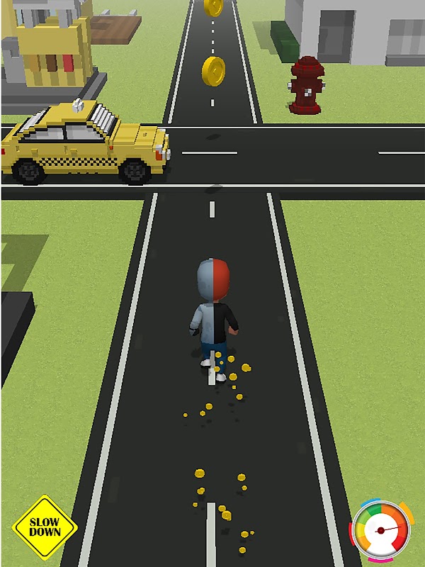 Il corridore è sotto il tuo controllo. Puoi accelerare il corridore o rallentarlo, dipende da cosa devi evitare. Ci sono blocchi stradali, auto in movimento, camion, furgoni, persino taxi. Non ci sono luci di stop agli incroci, quindi è meglio saltare quando un'auto si avvicina, rallentare o accelerare.