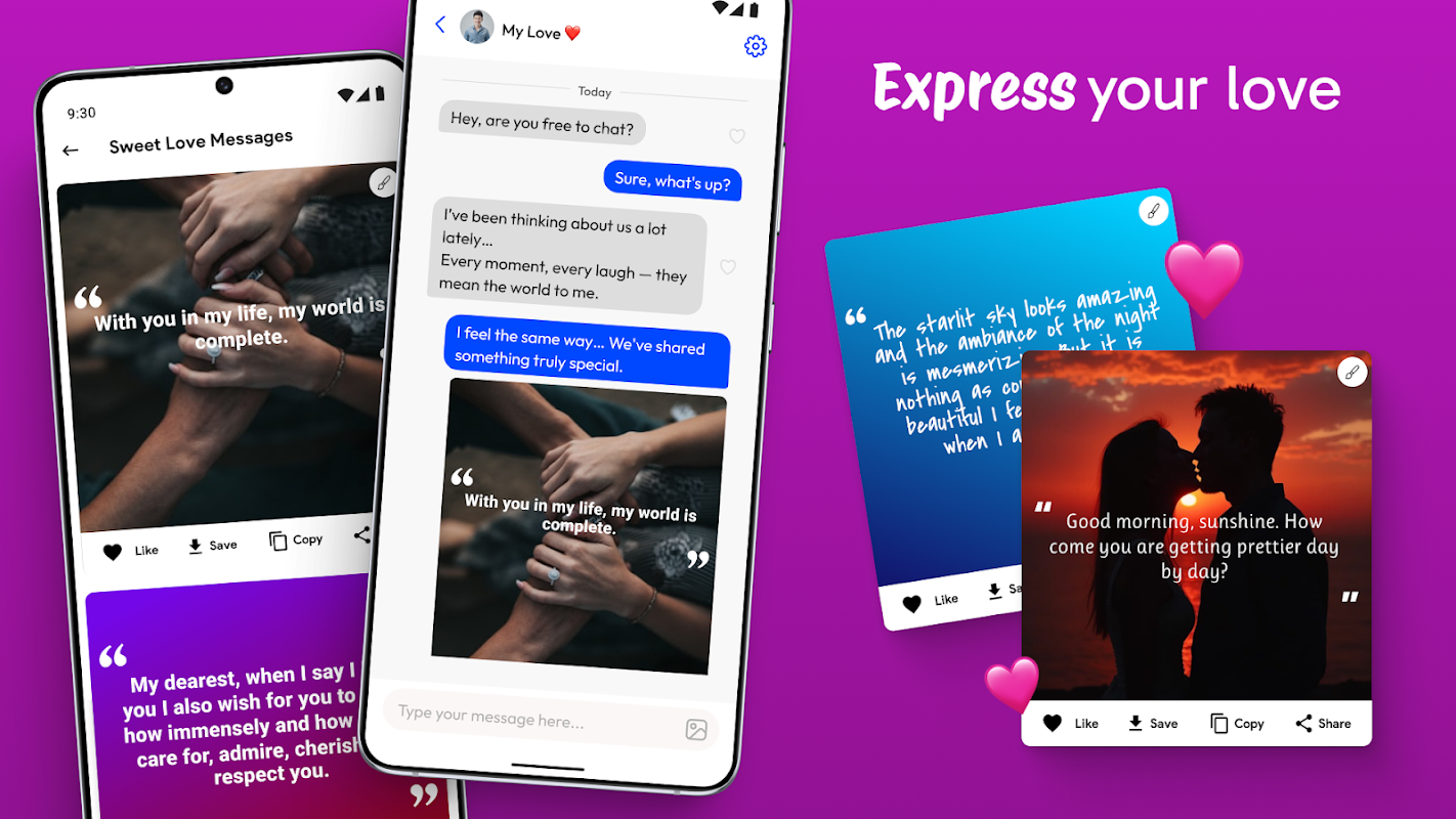 Scarica subito la nostra app Love ed esplora migliaia di messaggi d'amore, sms d'amore e messaggi di testo d'amore che toccheranno il cuore del tuo partner. Che si tratti di un dolce SMS di buongiorno d'amore o di una sincera citazione d'amore, troverai tutto ciò di cui hai bisogno per esprimere il tuo amore e rafforzare la vostra relazione. Inizia a condividere l'amore oggi!