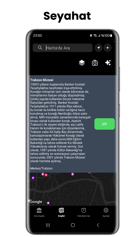 Consigli esclusivi e percorsi di scoperta: l'app offre un'ampia gamma di consigli, dalle spiagge più belle della Turchia ai musei archeologici di livello mondiale. Fornisce consigli dettagliati ai viaggiatori su caratteristiche come i 10 migliori musei, le spiagge più pulite e altro ancora.