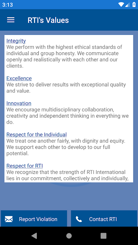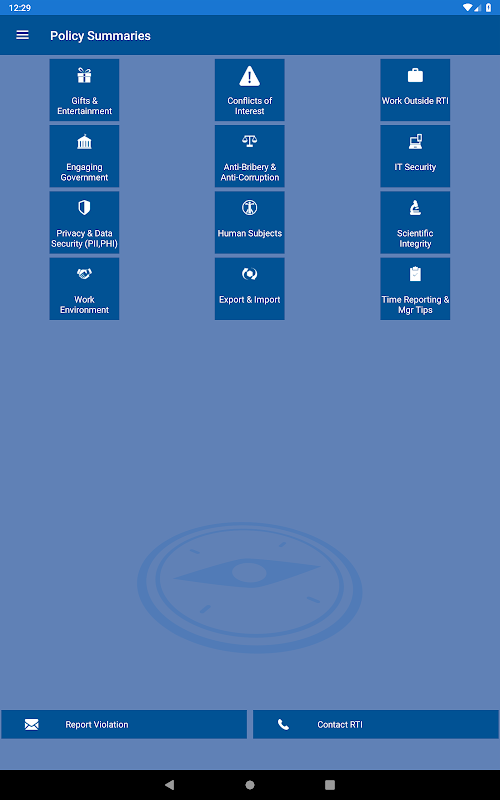This tool is intended for RTI employees and business partners and provides quick, convenient access to our Ethics and Compliance core program. You will find access to our values, standards, Code of Conduct, policy summaries and more.