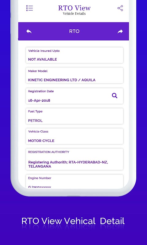 The app gives following RTO vehicle registration information details by using vehicle number :