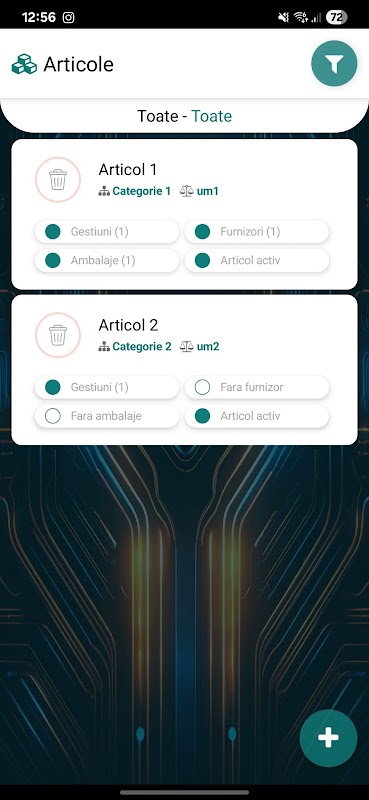 L'applicazione permette di creare ubicazioni, gestioni, categorie merceologiche, unità di misura, packaging e prodotti. Ad ogni prodotto è possibile assegnare uno o più fornitori.