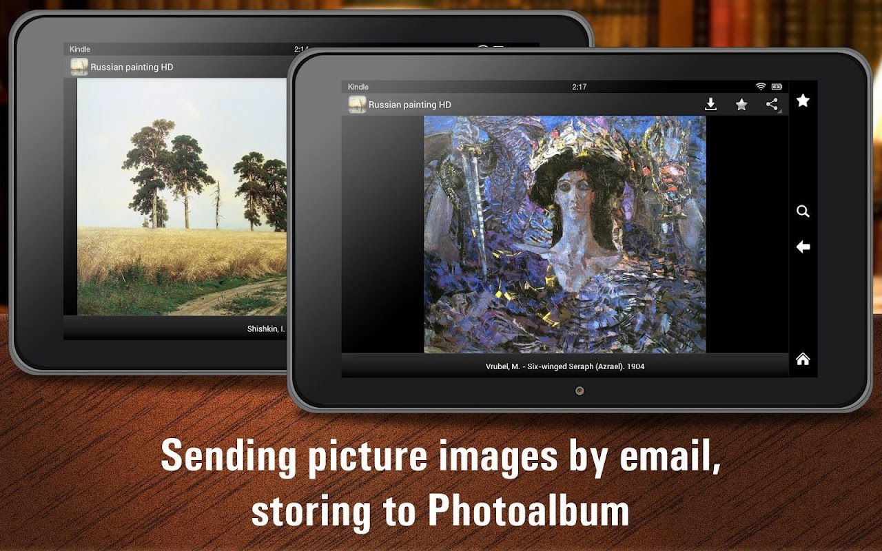L'applicazione contiene 1500 opere di 250 grandi pittori russi - Aivazovsky, Shishkin, Savrasov, Repin, Levitan, Vrubel, Roerich, Surikov, Vasiliev e altri famosi pittori.