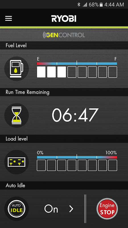 RYOBI GenControl App permette di associare il telefono con il Ryobi RYi2300BTA Inverter Generatore utilizzando la tecnologia Bluetooth. L'applicazione in modalità wireless mostra il livello in tempo reale di carburante, livello di carico e autonomia residua del vostro generatore portatile. L'applicazione consente inoltre di reset sovraccarico di distanza, e l'arresto a distanza dal telefono. Le informazioni visualizzate su App è identico alle informazioni visualizzate sullo schermo LCD del generatore. funzioni parallelo è supportato anche dal GenControl App.